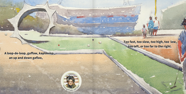 A Ball, Of Course moves you along that path with a poem exploring the ups and downs of playing ball - whether baseball, putt-putt, basketball, or ping pong. We know, a ball, of course, could veer off course and not land where you like, but when you keep at it and figure out what’s too fast, too slow, too high, too low...eventually, you’ll set your intention, swing, and successfully see your ball zipping down the green!